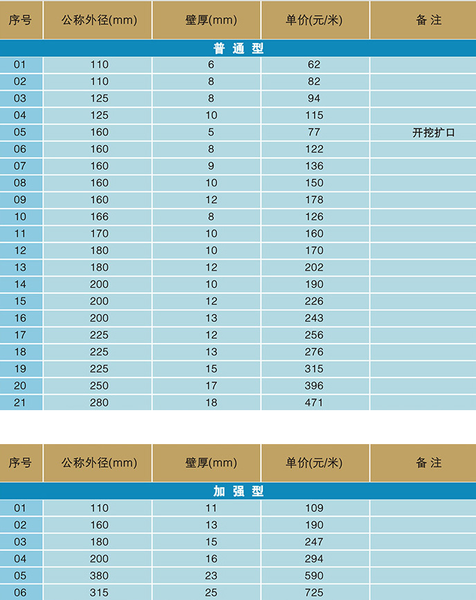 韌性好,具有優(yōu)良的抗地層沉降及抗震性能。常用管材分為普通型和加強(qiáng)型。普通型適用于開(kāi)挖鋪設(shè)施工和非開(kāi)挖穿越施工埋深小于4米的工程;加強(qiáng)型用于非開(kāi)挖穿越施工埋深大于4米的工程。